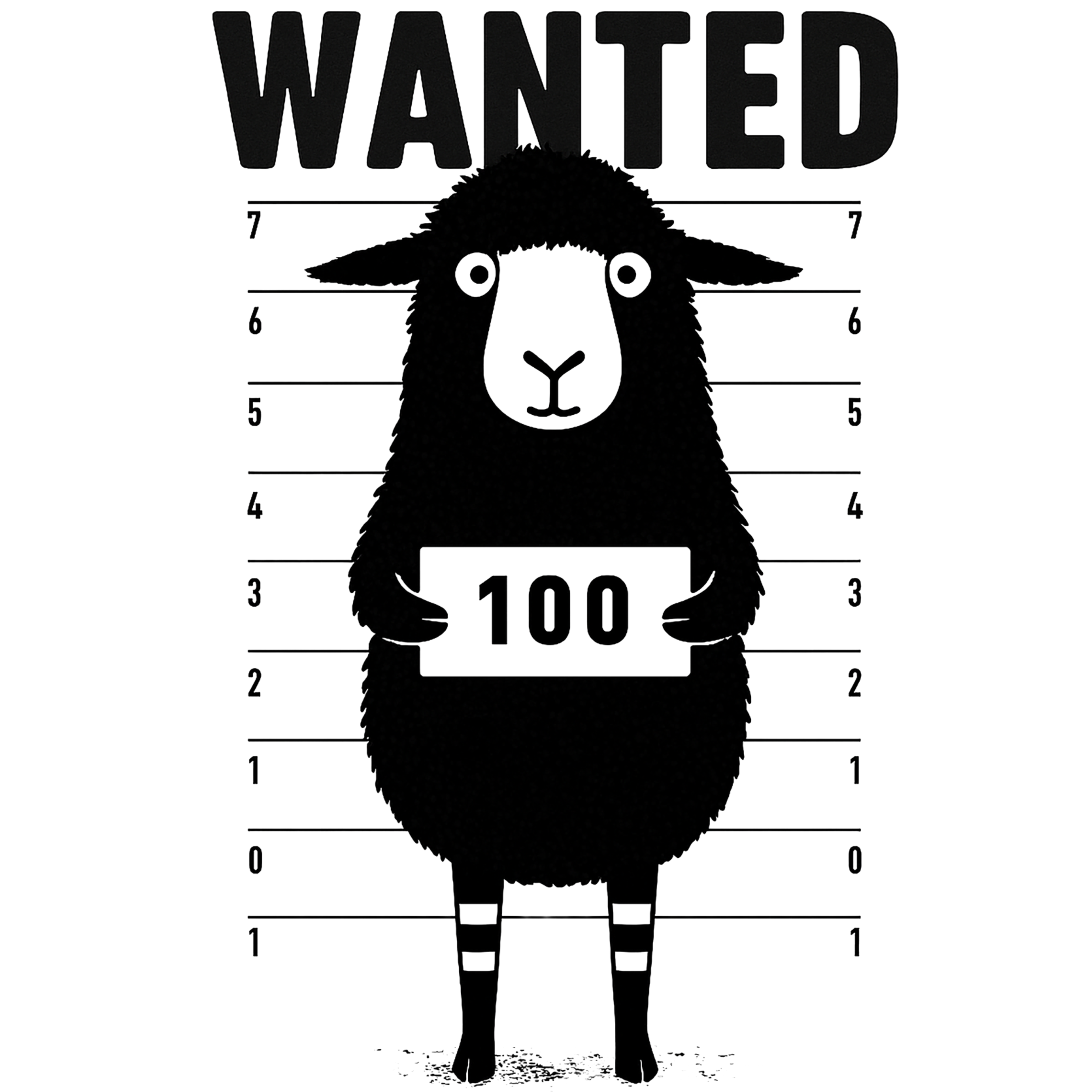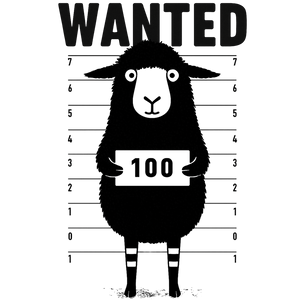- 🖤 Design: A cartoon black sheep in a mugshot lineup with ‘WANTED’ text and prisoner number '100' – giving off serious lineup vibes from a security station.
