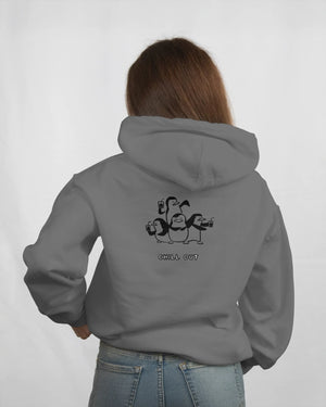 Need to take a break from the world? Let these cool customers lead the way. This hoodie is the ultimate invitation to relax, featuring a group of penguins casually socializing with drinks in hand and the simple, perfect command: "CHILL OUT."