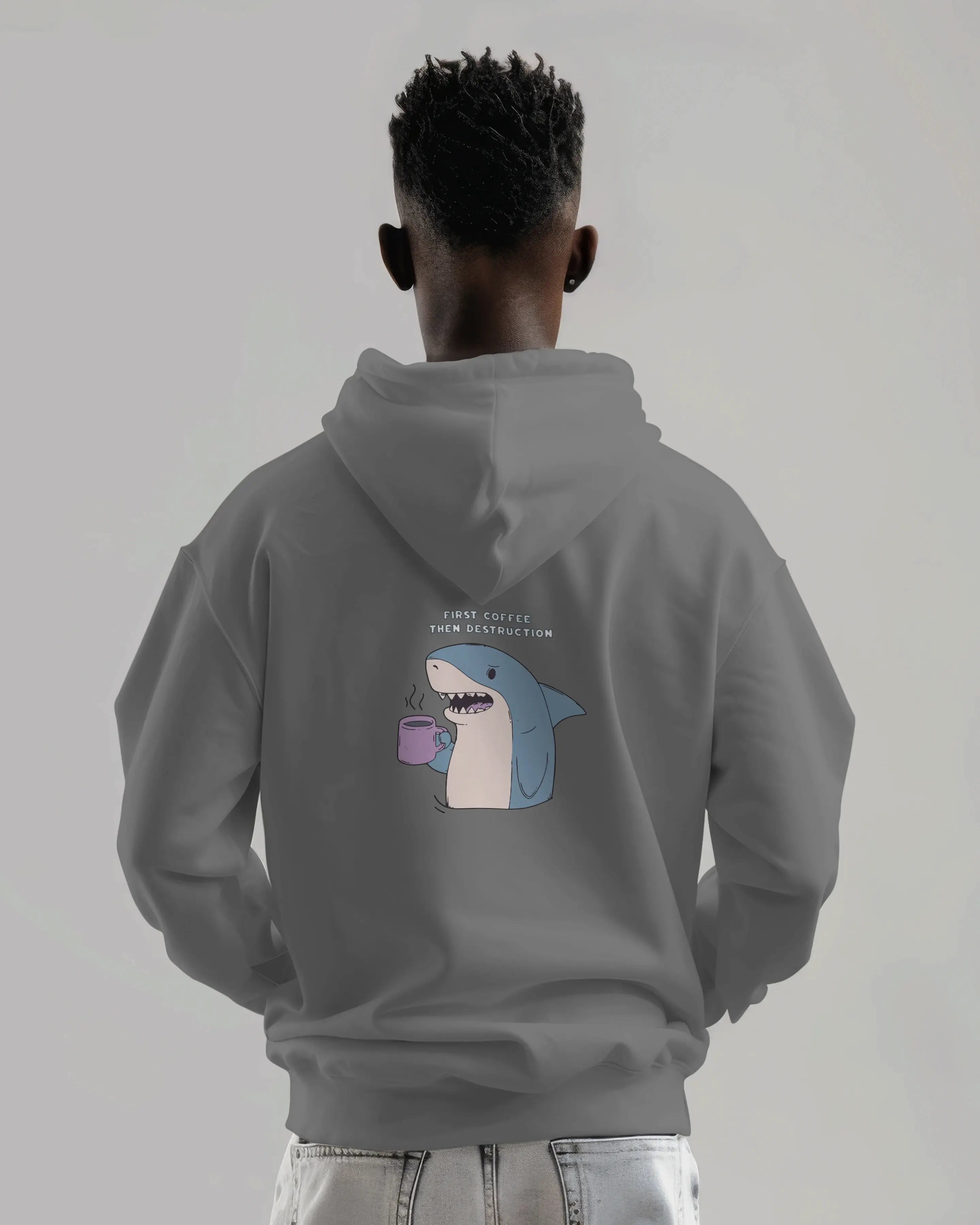 Before you can unleash your day, you need your fuel. This hilarious hoodie is for coffee addicts and ambitious go-getters everywhere. It features a cheerful, slightly maniacal Shark raising a mug with the only acceptable mantra: "FIRST COFFEE THEN DESTRUCTION."
