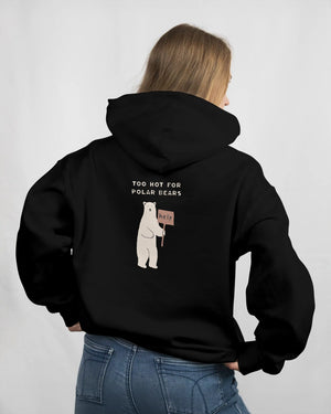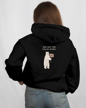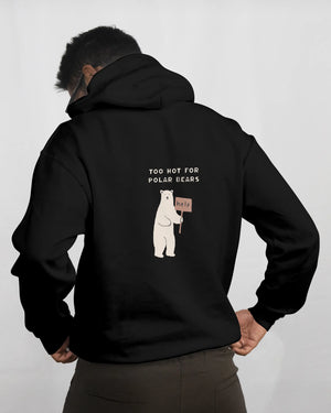 This hoodie says what we're all thinking. Featuring a highly detailed, printed polar bear on a tiny melting ice patch holding a desperate "Help" sign, it pairs dark humor with a serious environmental message. The text "Too Hot for Polar Bears" drives the irony home.
