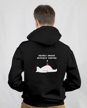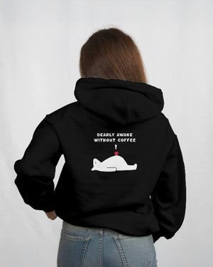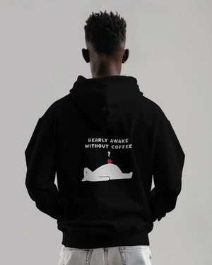 The Essential Morning Uniform. For everyone who needs a literal ton of caffeine to function. This hoodie features a hilariously collapsed bear lying flat, propped up only by a coffee cup, and the perfect pun: "BEARLY AWAKE WITHOUT COFFEE." The classic Black color and oversized fit offer max comfort for those tired days.